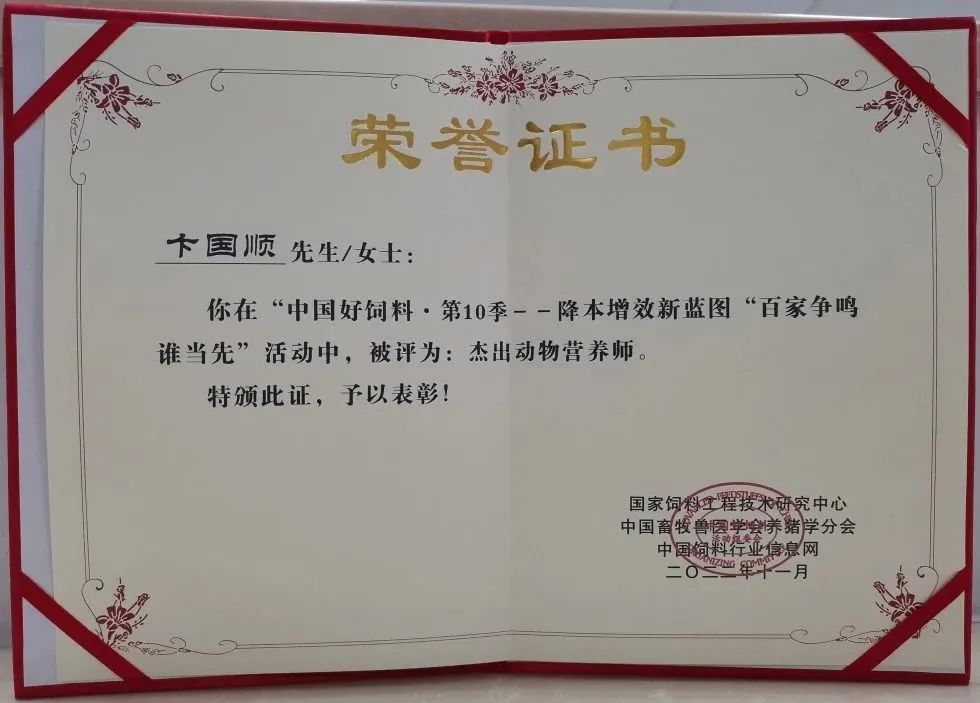 我司副總經(jīng)理、CTO卞國順先生獲得“杰出動物營養(yǎng)師、2013-2022十周年最美動物營養(yǎng)師”的榮譽。