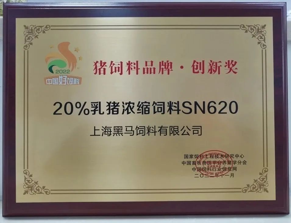 我司20%乳豬濃縮料SN620產(chǎn)品榮獲“中國好飼料2022——豬飼料品牌·創(chuàng)新獎”。