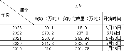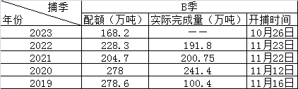 從上圖可以看出2023年A季秘魯能提供中國(guó)市場(chǎng)的魚粉量幾乎為零,2023年B季魚粉開捕處于歷史最早月份。