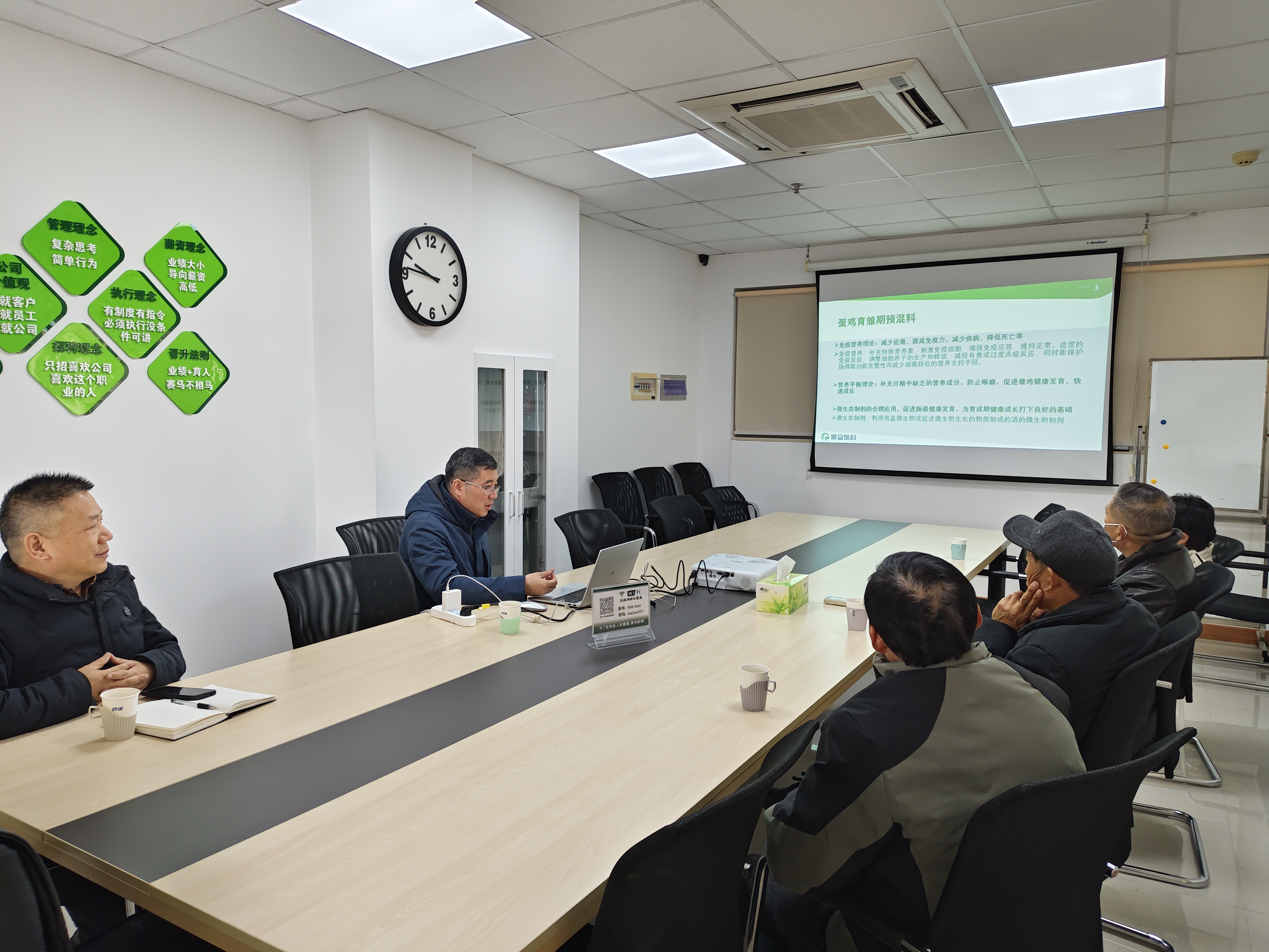 我司副總經理卞總向葉總一行介紹了我司高性能蛋雞預混料系列產品,從產品的設計理念到產品特色,做了詳細講解。并解答了大家在蛋雞養(yǎng)殖過程中遇到的各種問題。